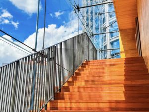 構造の要となる四本の多角柱は柱脚をXY軸に沿う1.4m角の正方形とし,柱頭はキューブの隅へ迎えに行く形で荷重を合理的に受け流す設計です。2階の梁と柱には最大で梁380トン,柱150トンのポストテンションを掛け,複雑な型枠と配筋を貫通するシース管の取り回しを三次元で検証しながら施工しています。吹抜けに架かる階段とコンクリートとガラススクリーンの間に配された半屋外階段(3〜4階)が回遊を促し,来訪者の動線が建物の外貌へと映し出されます。