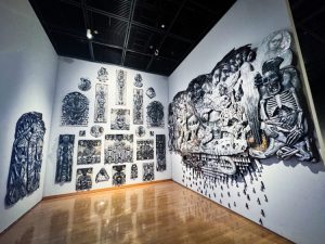 三位一体の立体曼荼羅として構成された本作は,ダンボールという容易に傷つき崩れる素材を用い,それを描き,破壊し,再構築し,最終的に高光沢の樹脂で固めるという四段階の工程を経て完成しました。これは精神医学におけるカタルシスから自己再編成に至る治癒のプロセスそのものを物質化したものであり,かつて脆かった素材が樹脂によって脂で固められたかのような妖しい光を纏い,時間の風化に耐える「聖遺物」へと変質する錬金術的な転換が起きています。福田美蘭氏や山下裕二氏が評したように,負のエネルギーを正へと転じさせる狂気的な執念が本作には宿っており,観客の身体に直接訴えかける力を持っていました。